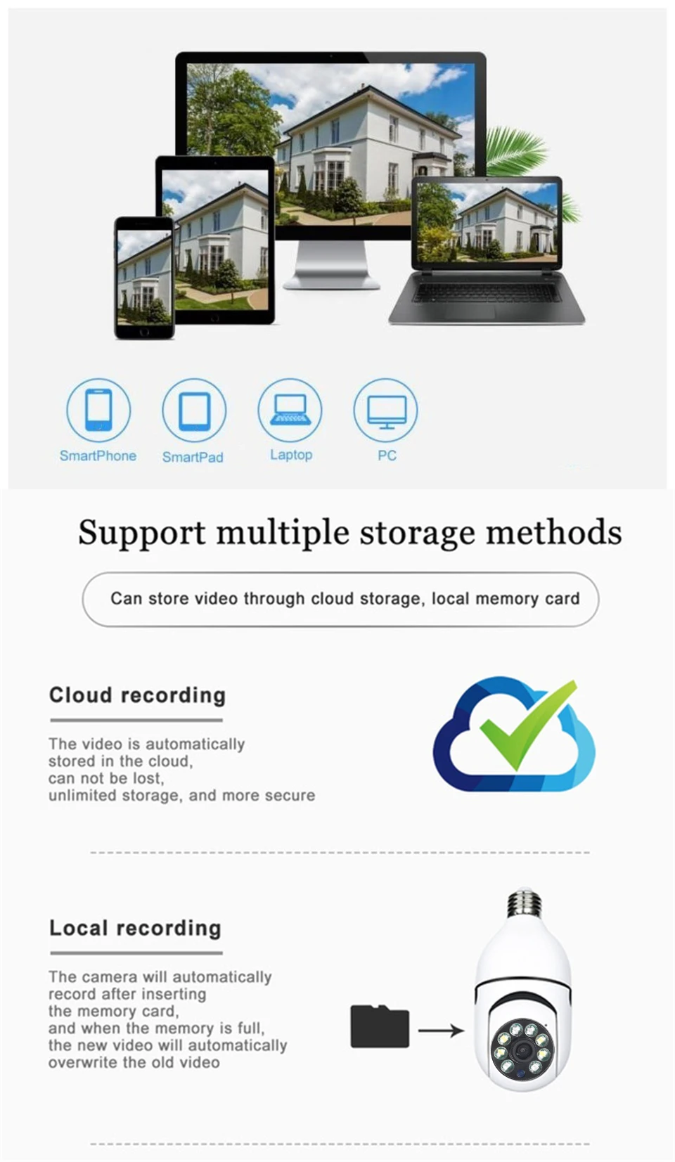 Integrated 4 white LEDs and 4 IR LEDs, which monitor moving objects and automatically illuminate. This is an impressive means against crime.