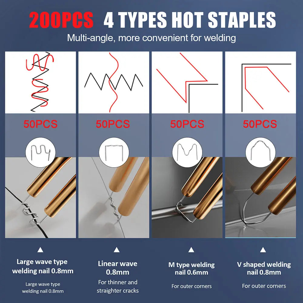 Package includes: welding device, 200 welding clips (4 variations), USB cable, instruction manual